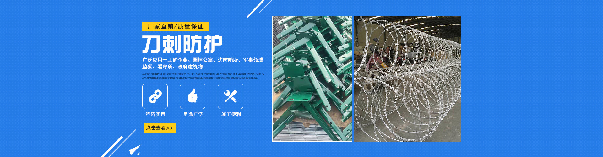 安平初日絲網(wǎng)有限公司主要產(chǎn)品有刀片刺繩、刺絲滾籠、刺繩支架、護欄網(wǎng)、隔離網(wǎng)、球場圍網(wǎng)等多種產(chǎn)品,公司擁有先進的生產(chǎn)設(shè)備和技術(shù),以“質(zhì)量求生存,信譽謀發(fā)展”為生產(chǎn)原則,為新老用戶提供高質(zhì)量產(chǎn)品。